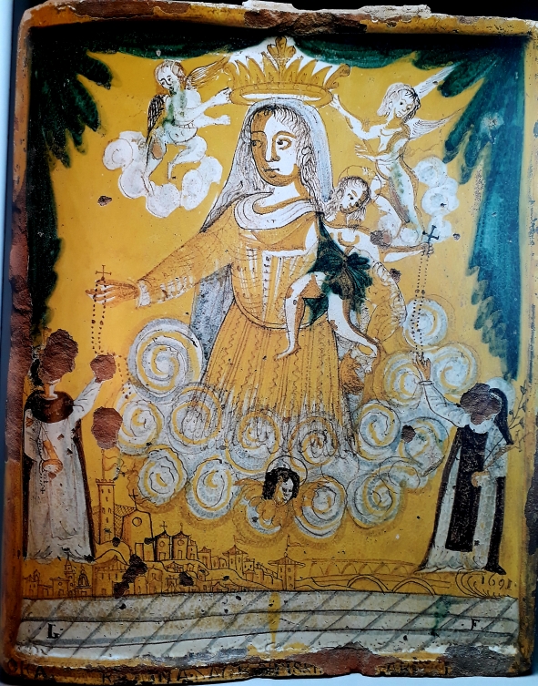 La Madonna del Rosario ebbe nei secoli una vasta gamma di raffigurazioni artistiche, di solito seduta in trono con il Bambino in braccio, in atto di mostrare o dare la corona del rosario; la più conosciuta è quella in cui la corona viene data a Santa Caterina da Siena e a San Domenico di Guzman, inginocchiati ai lati del trono. Con la Controriforma, fra Cinque e Seicento, ampio respiro viene dato al culto di Maria, a protezione della famiglia e della comunità in generale. Le targhe maiolicate mostrano immagini sacre a colori che si stagliano su uno sfondo giallo brillante conforme alla sensibilità barocca, prodotti che in questi difficili decenni si immedesimano nella rinnovata fede dell’uomo, indispensabile per superare gli stenti della quotidianità e le sofferenze dovute alla perdita dei cari per via di carestie, guerre e malattie.