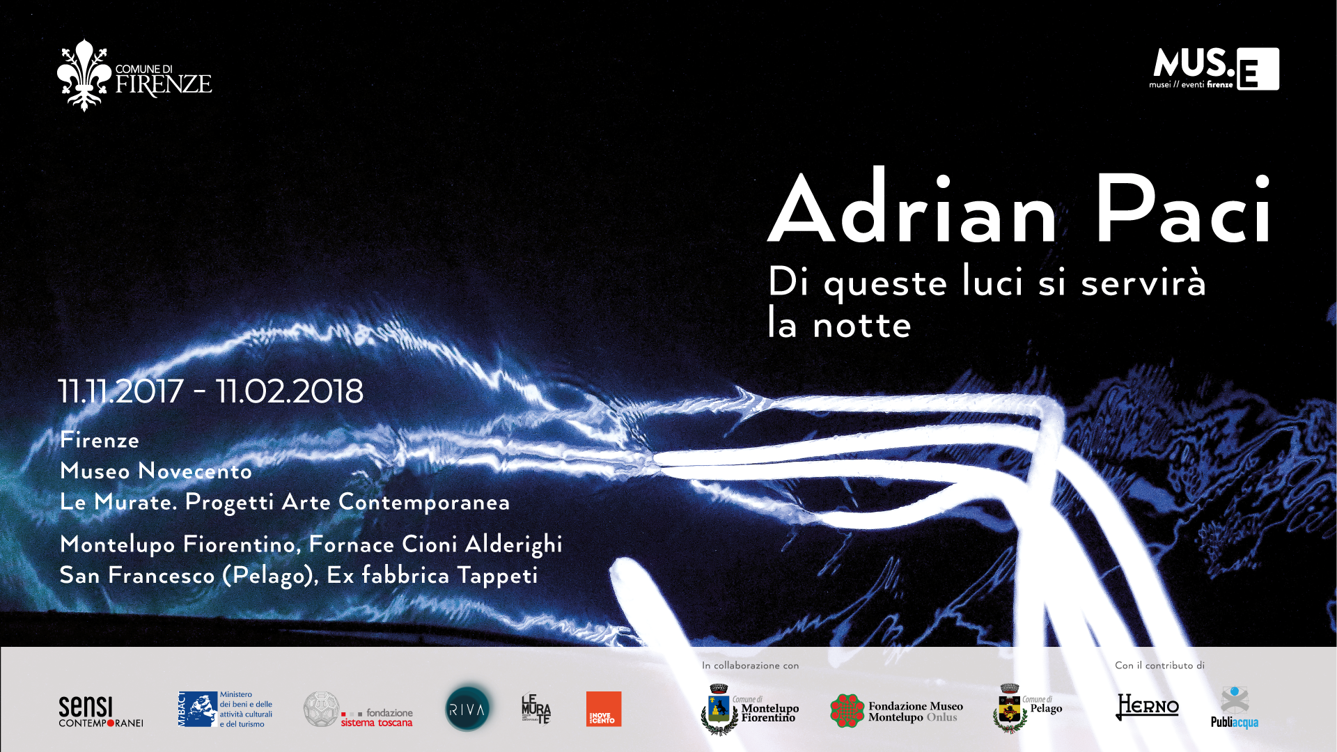 Adrian Paci (Scutari, 1969) è tra gli artisti più noti del panorama artistico internazionale. All’interno delle sue opere (pitture, installazioni, video, fotografie) indaga la condizione umana sempre in transito e la complessità delle dinamiche sociali, politiche e culturali del nostro presente. Dopo gli studi di pittura presso l’Accademia di Belle Arti di Tirana, nel 1997 Paci lascia l’Albania e si trasferisce a Milano dove attualmente vive e lavora. Per le città di Firenze, Montelupo Fiorentino e Pelago, Paci ha pensato ad un progetto artistico, Di queste luci si servirà la notte, sui temi della migrazione, dell’identità, del flusso e dell’acqua che include una nuova produzione e una mostra diffusa in più sedi. La prima ha previsto la realizzazione di una performance sulle acque del fiume Arno (settembre 2017) e di un video di documentazione; la seconda è stata un’esposizione temporanea sviluppata tra il Museo Novecento, Le Murate. Progetti Arte Contemporanea e i comuni di Pelago e Montelupo Fiorentino, luoghi satellite che hanno ospitato nelle loro sedi espositive una selezione di lavori di Adrian Paci, pitture, video, sculture e installazioni rappresentative della sua ricerca e legate all’elemento dell’acqua.