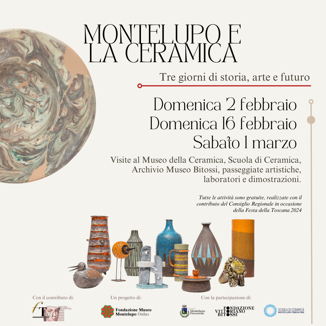 Montelupo Fiorentino celebra la sua storica tradizione ceramica con una serie di eventi imperdibili! Tre giornate all’insegna della cultura, della creatività e della scoperta: un’occasione unica per esplorare la città, il Museo della Ceramica, la Scuola della Ceramica e la Fondazione Archivio Bitossi, con attività gratuite e laboratori per grandi e piccini. Tutti gli eventi sono realizzati grazie al contributo del Consiglio Regionale in occasione della Festa della Toscana 2024.