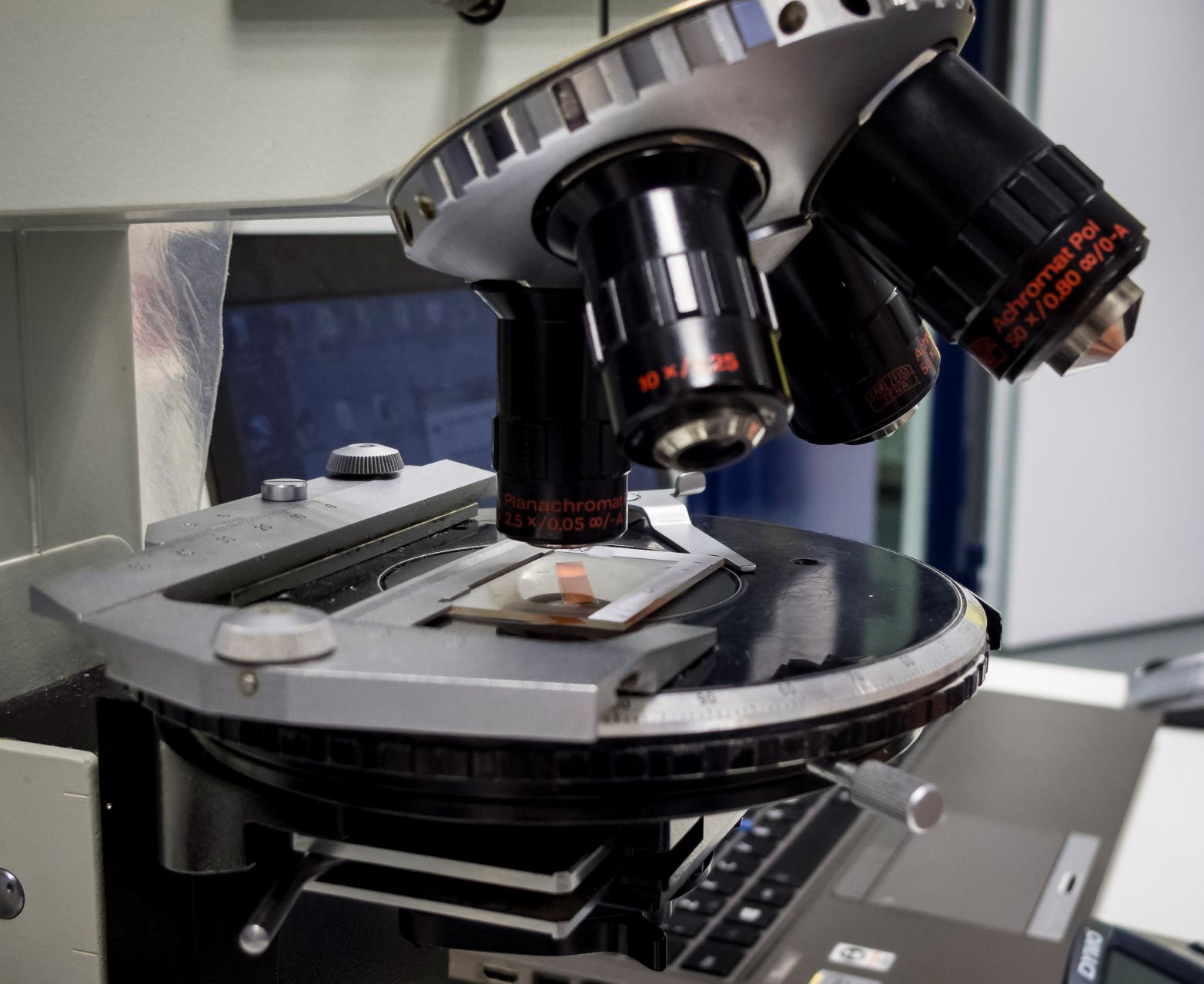 Sezione sottile in fase di studio con un microscopio petrografico. -