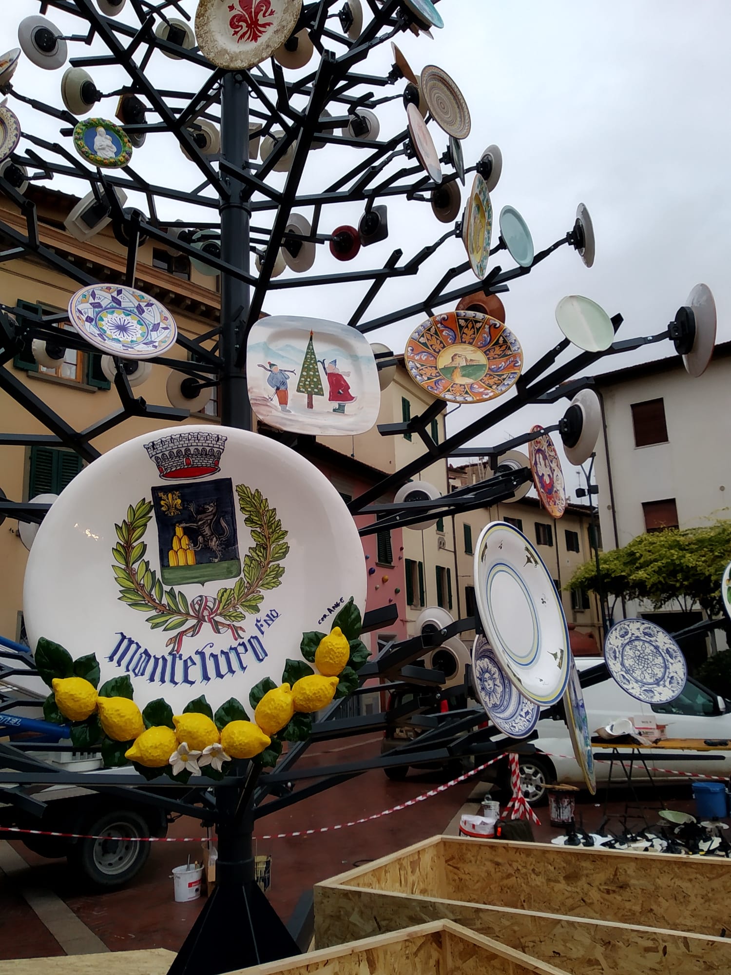 Due sculture imponenti, interamente decorate da oggetti donati dalle aziende della Strada della Ceramica, con giochi di luce che riflettono i decori di Montelupo, raccontano la storia e la passione di questa città per la sua arte e la sua storia.
