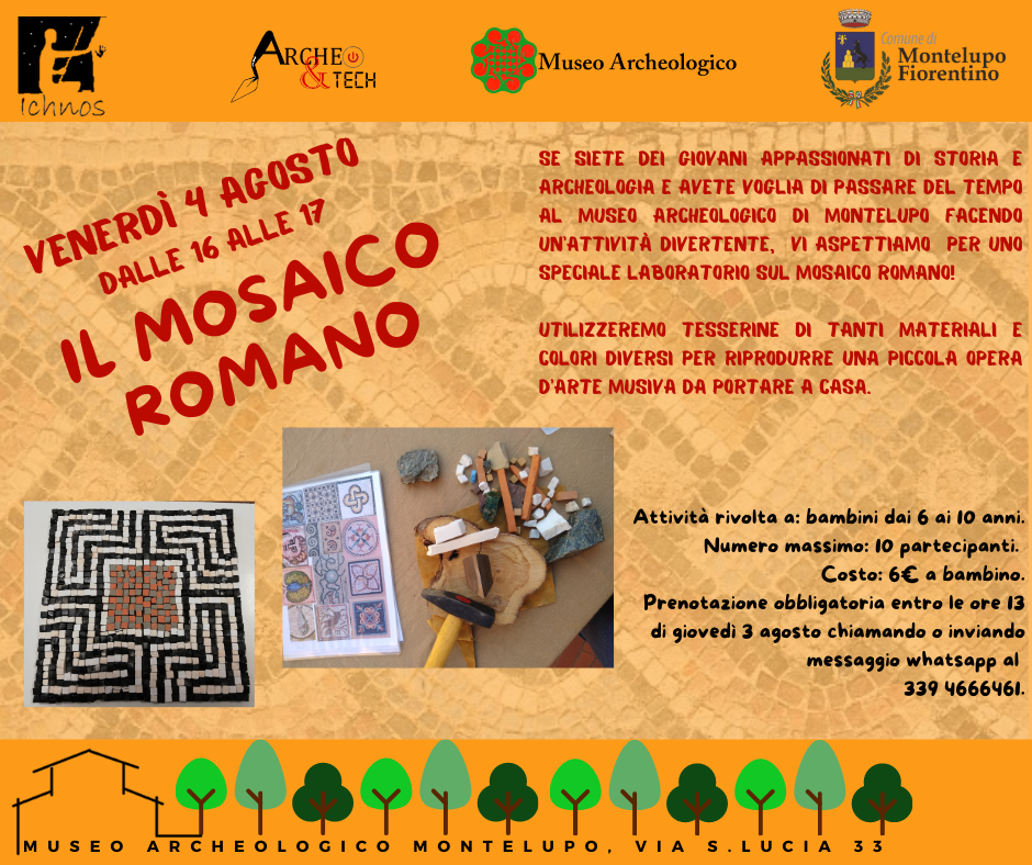 Un laboratorio per ragazzi dedicato all'archeologia e alla scoperta della tecnica del mosaico, utilizzata fin dall'antichità per realizzare pavimentazioni e rivestimenti parietali. Gli antichi romani furono tra i più grandi estimatori di questa forma d'arte e, attraverso le scoperte archeologiche del nostro territorio, scopriremo che anche a due passi da casa nostra si nascondono bellissimi mosaici di età romana. I bambini potranno usare tesserine di tanti materiali e colori diversi per riprodurre una piccola opera d'arte musiva da portare a casa.