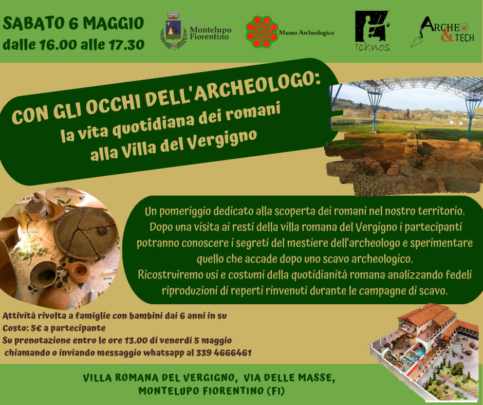 Un pomeriggio dedicato alla scoperta dei romani nel nostro territorio alla Villa romana del Vergigno. Dopo una visita ai resti archeologici i partecipanti potranno conoscere i segreti del mestiere dell'archeologo e sperimentare quello che accade una volta scavati i reperti: ricostruiremo usi e costumi della quotidianità romana analizzando fedeli riproduzioni di oggetti rinvenuti durante le campagne di scavo.