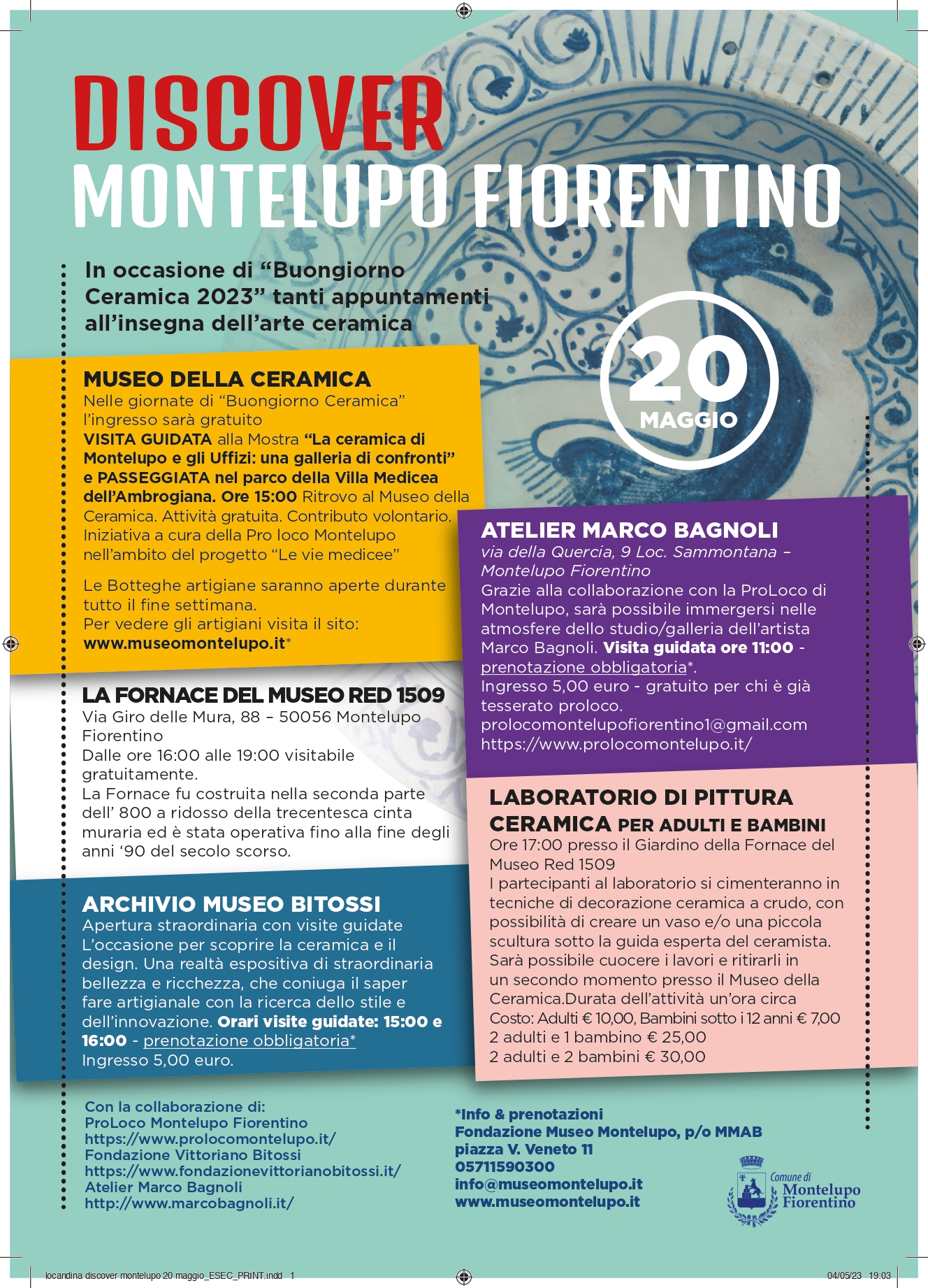 Costo: Occorre essere in possesso della tessere Pro Loco Montelupo 2023, il costo della tessera è di € 5,00 ed è possibile sottoscriverla presso il Museo della Ceramica di Montelupo Fiorentino oppure presso l’Atelier Bagnoli poco prima l’inizio della visita guidata. Prenotazione obbligatoria.