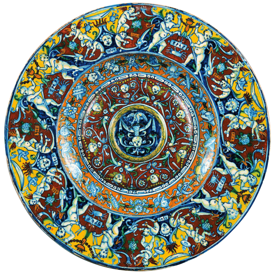 Un capolavoro della maiolica rinascimentale italiana: un bacile di straordinaria ricchezza cromatica e decorativa datato 1509. Il suo nome particolare deriva dal pigmento rosso usato nella decorazione, la cui composizione rimane ancora oggi un mistero.
