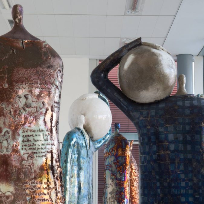 Entriamo ora nel merito dell’anima familiare e antica del progetto. Anni fa Paolo Staccioli (nato nel 1943) era solito percorrere ancora a piedi Firenze per via della sua professione a servizio della comunità, senza pensare di poter realizzare sculture in ceramica o bronzo. Però quel camminare e convivere per buona parte del giorno con le visioni di Palazzo Pitti e Piazza della Signoria e con le loro sculture di marmo, ma soprattutto bronzi e bassorilievi in ceramica a ornamento di piazze ed edifici della città o conservate nei suoi musei, lo ha sottoposto a ventate di bellezza e ispirazione che hanno senza dubbio aperto dei varchi e dei passaggi nella sua sensibilità. Fatto sta che quell’osservatore involontario decide un giorno all’inizio degli anni Novanta di cimentarsi, dopo aver già praticato la pittura, con la scultura in ceramica, diventata col tempo la sua seconda natura. Paolo Staccioli, ad oggi, è uno dei più interessanti scultori che utilizzano in senso arcaico ma non vernacolare, iconograficamente antico ma sensibilmente contemporaneo ed antimonumentale, artigianale ma libero da funzioni, la ceramica ed il bronzo dando vita a figure poetiche, intime, incantate e innocenti allo stesso tempo.