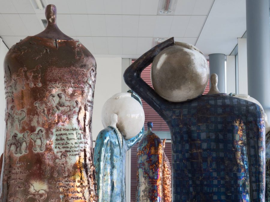 Entriamo ora nel merito dell’anima familiare e antica del progetto. Anni fa Paolo Staccioli (nato nel 1943) era solito percorrere ancora a piedi Firenze per via della sua professione a servizio della comunità, senza pensare di poter realizzare sculture in ceramica o bronzo. Però quel camminare e convivere per buona parte del giorno con le visioni di Palazzo Pitti e Piazza della Signoria e con le loro sculture di marmo, ma soprattutto bronzi e bassorilievi in ceramica a ornamento di piazze ed edifici della città o conservate nei suoi musei, lo ha sottoposto a ventate di bellezza e ispirazione che hanno senza dubbio aperto dei varchi e dei passaggi nella sua sensibilità. Fatto sta che quell’osservatore involontario decide un giorno all’inizio degli anni Novanta di cimentarsi, dopo aver già praticato la pittura, con la scultura in ceramica, diventata col tempo la sua seconda natura. Paolo Staccioli, ad oggi, è uno dei più interessanti scultori che utilizzano in senso arcaico ma non vernacolare, iconograficamente antico ma sensibilmente contemporaneo ed antimonumentale, artigianale ma libero da funzioni, la ceramica ed il bronzo dando vita a figure poetiche, intime, incantate e innocenti allo stesso tempo.